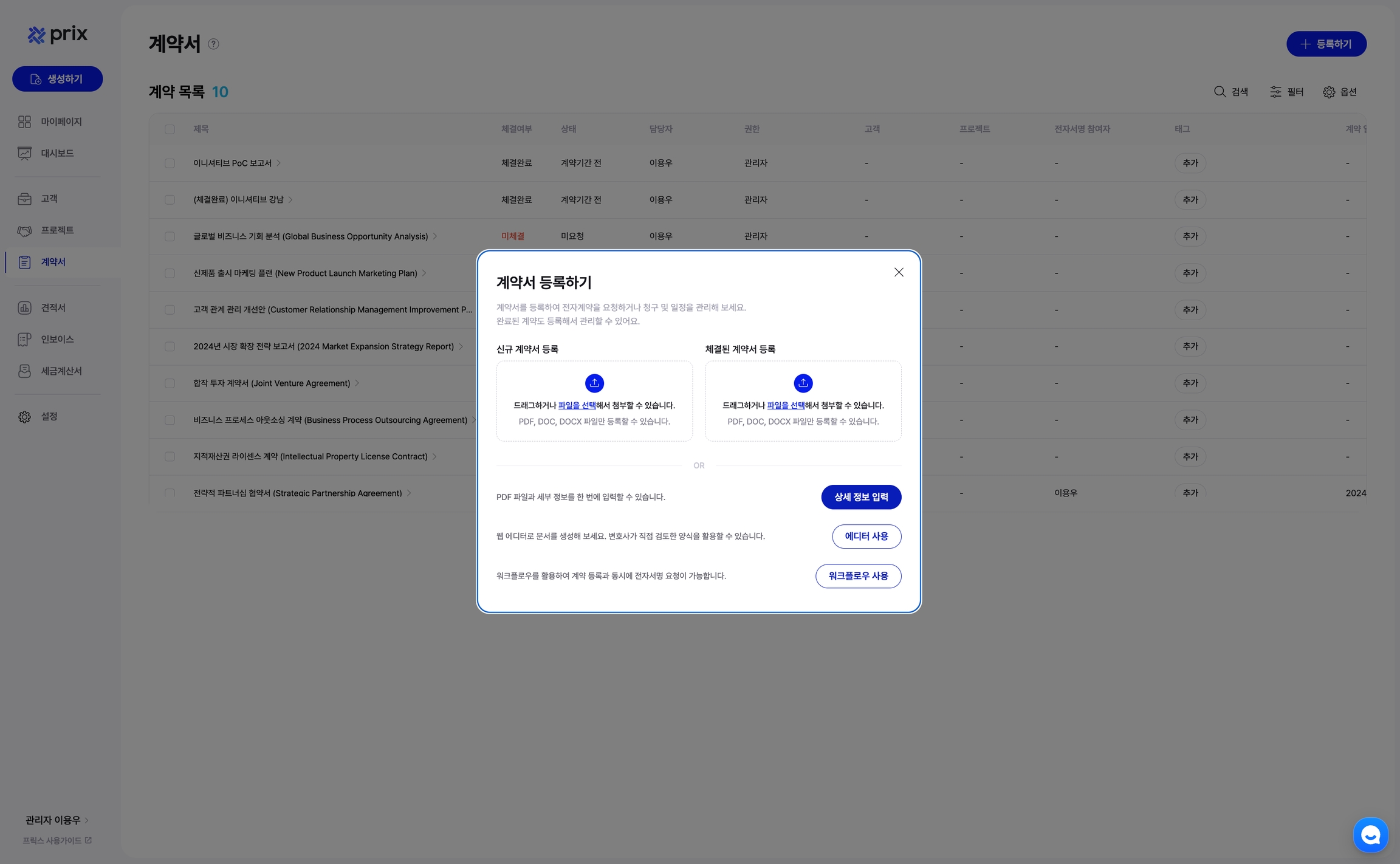 Register a contract and relevant details by clicking 'Enter details' in the create contract modal window.